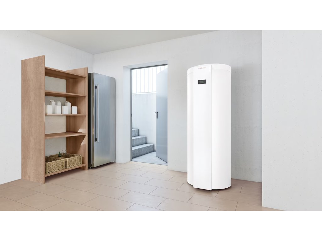 Kompaktné monoblokové tepelné čerpadlo Vitocal 060-A je vybavené všetkými komponentmi potrebnými na účinný ohrev teplej vody. Okrem modulu tepelného čerpadla obsahuje priestorovo úsporná skriňa 250-litrový alebo 180-litrový zásobník teplej vody a riadiacu jednotku.